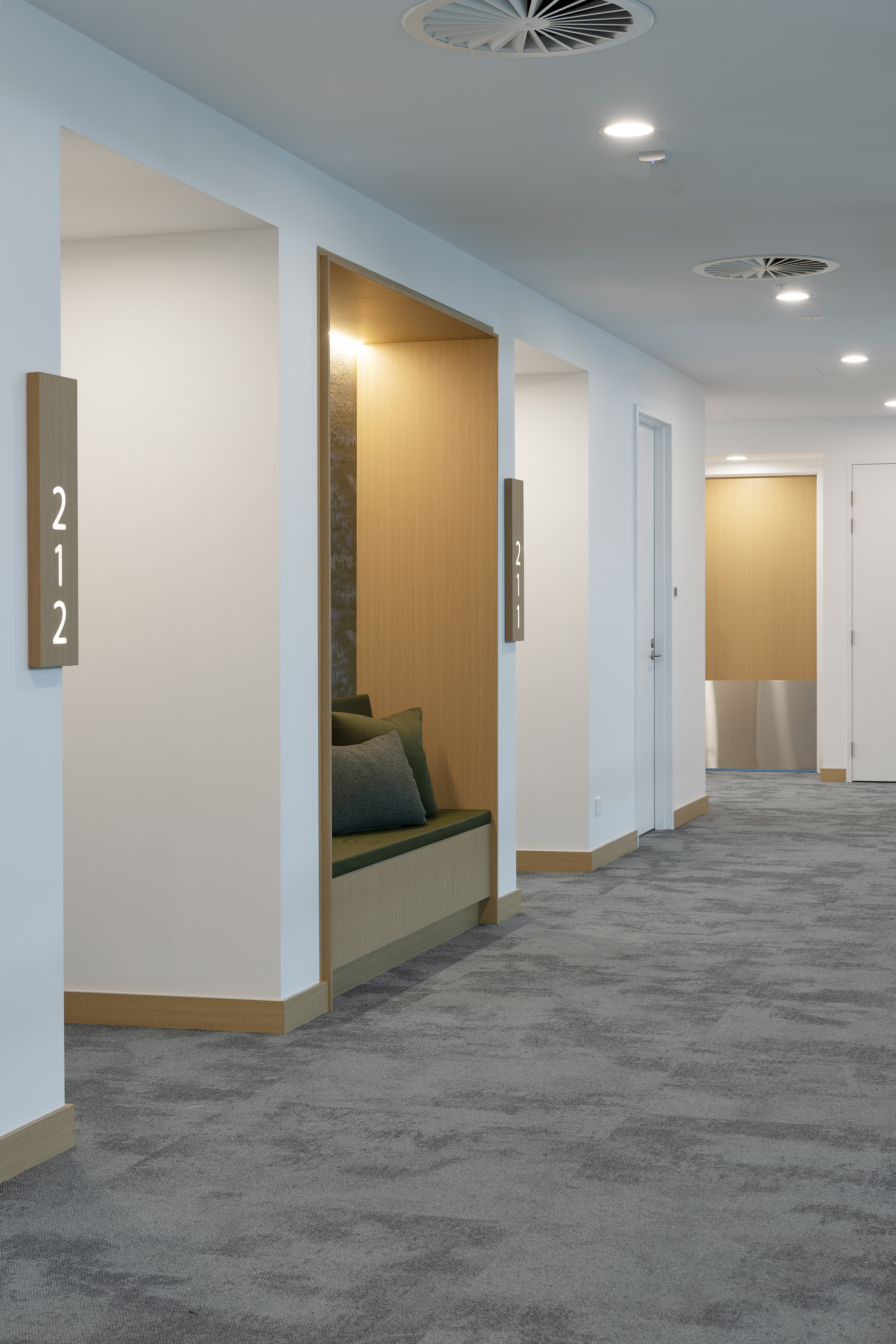 Fusing a sense of depth and luxury with a highly practical profile, the Near and Far carpet tile in NF401 was incorporated into the bedrooms and suites, bringing in the desired broadloom look and feel, while ensuring ease of maintenance and movement. “You get this sense of dimension and movement because there are highs and lows, and loops and shears built into the product,” Katrina Manila, Interface Design Studio Concept Designer explains.