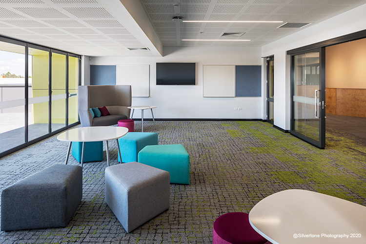 Santelli Architects are a WA-based architectural studio whose work spans more than 40 schools for Catholic Education WA. The brief for St John Bosco College was to create a modern Kindergarten to Year 12 College characterised by a dynamic design and parkland-like setting. The idea behind the interiors was to evoke the surrounding landscape and demonstrate consideration for the environment, while creating contemporary and flexible learning conditions to service the long-term needs of a growing school.