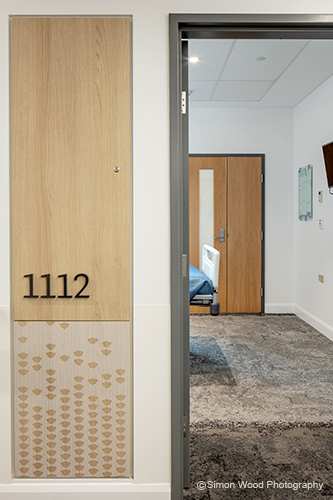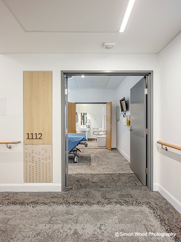 To achieve the desired colour, Hassell customised the product with the support of Interface’s Design Studio. The texture and tone of the carpet tile was extremely important to ensure that it would stand up to high foot traffic, rolling loads as well as be forgiving to stains. Carpet tile is a popular choice in bedrooms across private hospitals as it provides a more comforting feel to patients staying at the hospital. Sarah explains: ‘In the public sector, there are a lot of hard floor finishes throughout the corridor areas, while we always seek to provide a real homely and soft kind of environment for healthcare.’