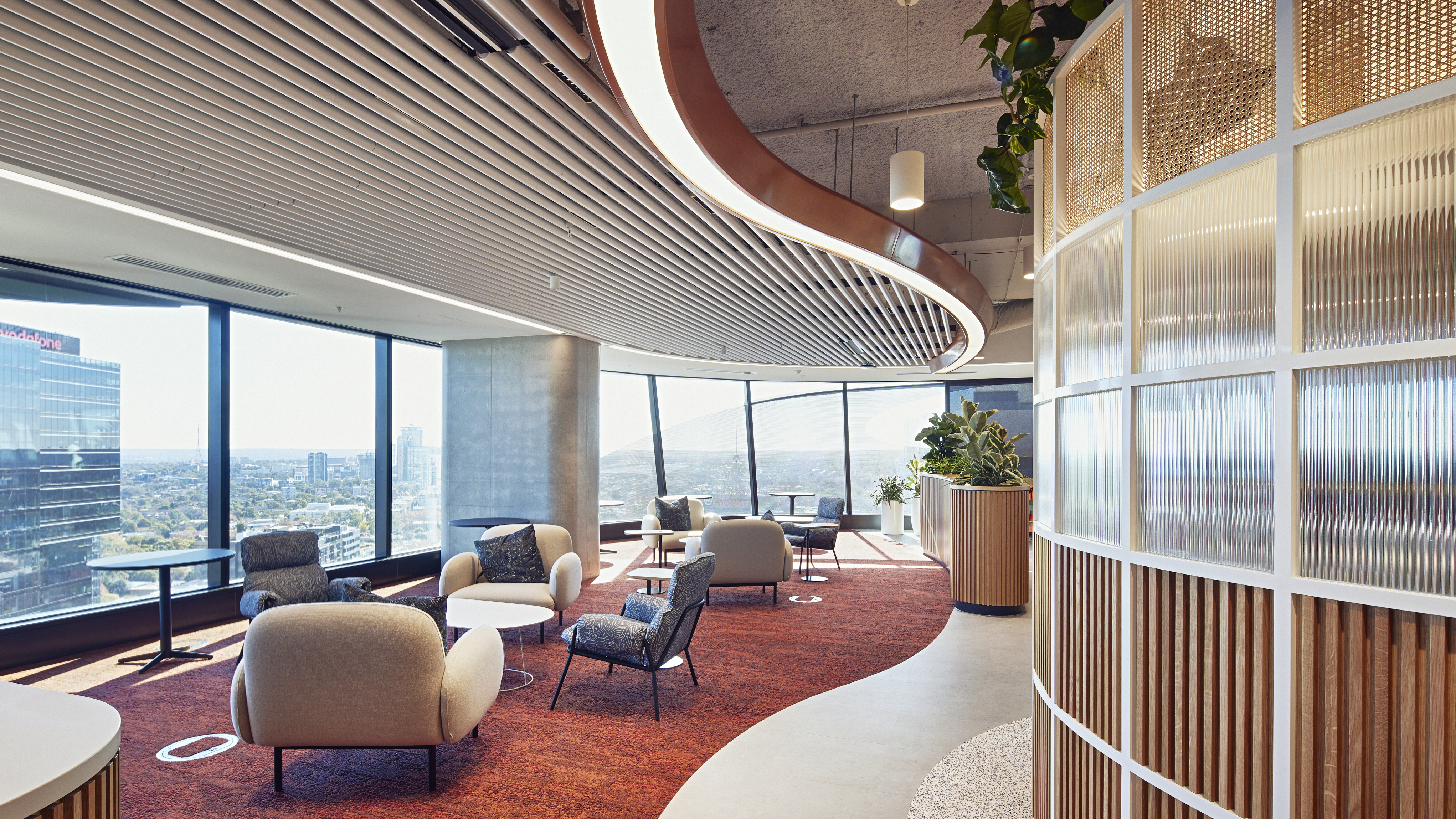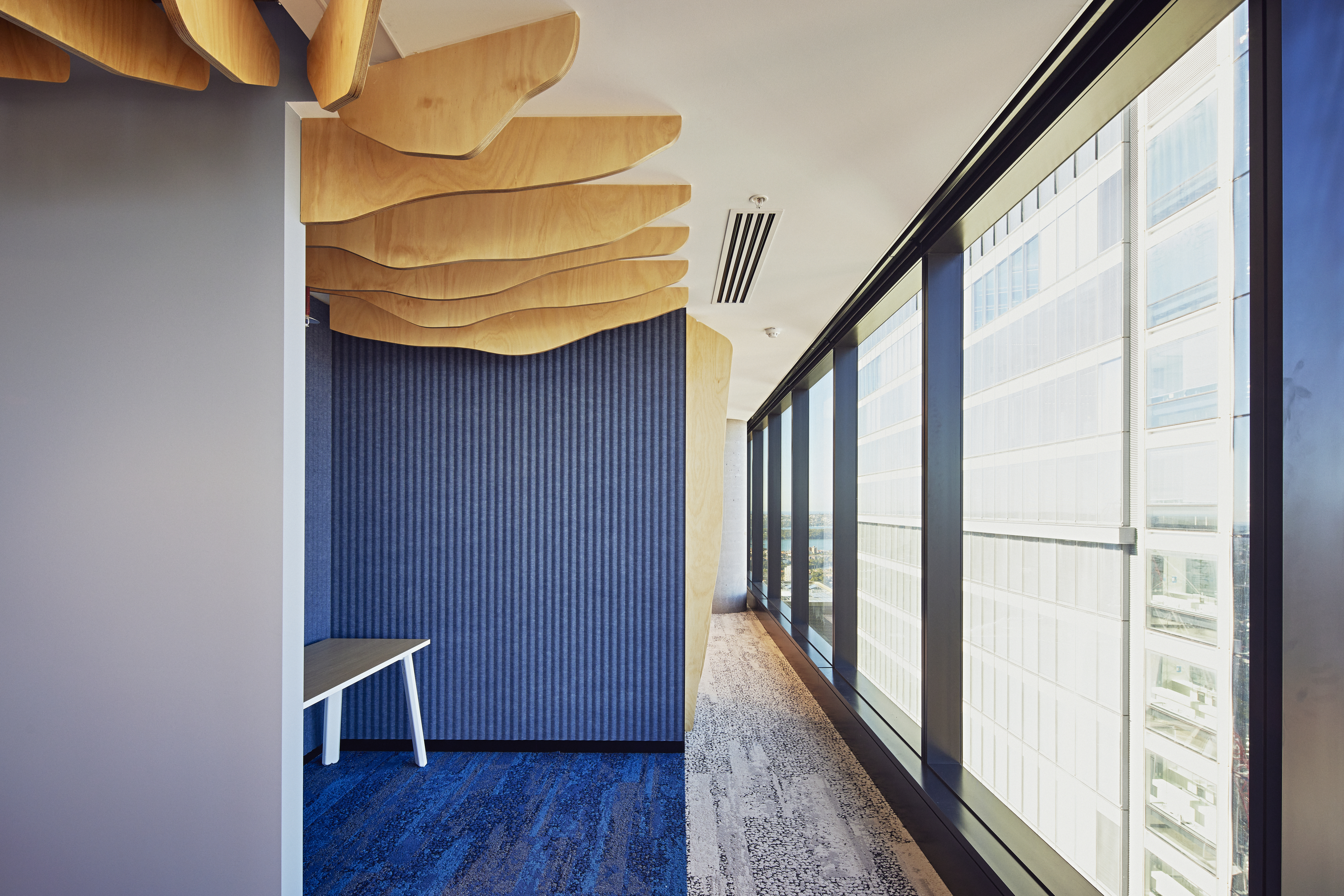 “Natural landmarks that imbue awe and wonder — where natural phenomena take place — are referenced throughout the space,” said Margiotta. “These natural landscapes were conceptually linked with Microsoft’s brand values. A distinctive rock wall simulates Cradle Mountain, while Sydney’s famous Figure Eight Pools inspire the customer floor on Level 28. Microsoft values creativity within their workspace to ensure that their staff are constantly innovating and being challenged to think outside the box.”